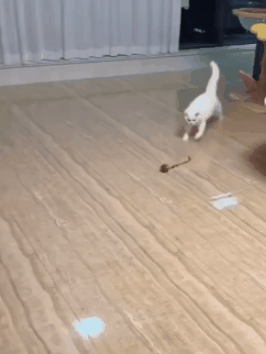 The ball moves randomly around the room, bouncing off walls and changing direction, mimicking small prey to entice playful chases.